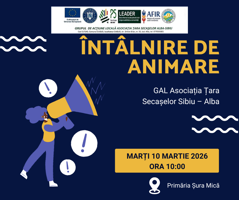 Tematici abordate: Condițiile de accesare a fondurilor pe baza Strategiei de Dezvoltare Locală GAL Asociația Țara Secașelor Sibiu – Alba.